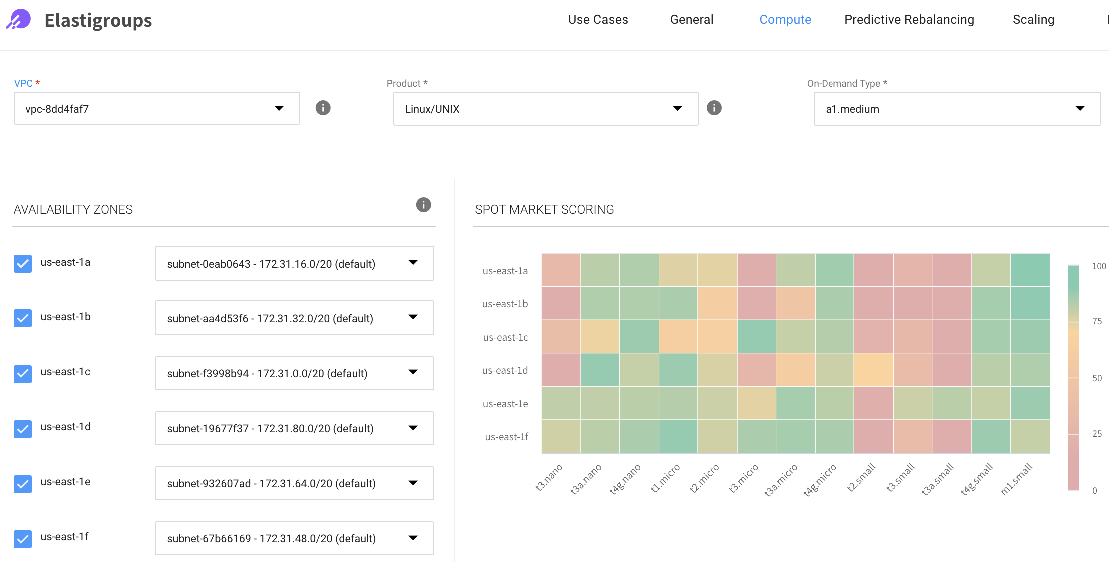 tipTo diversify the spot markets available to the Elastigroup, it is highly recommended to choose all the availability zones listed for the region.